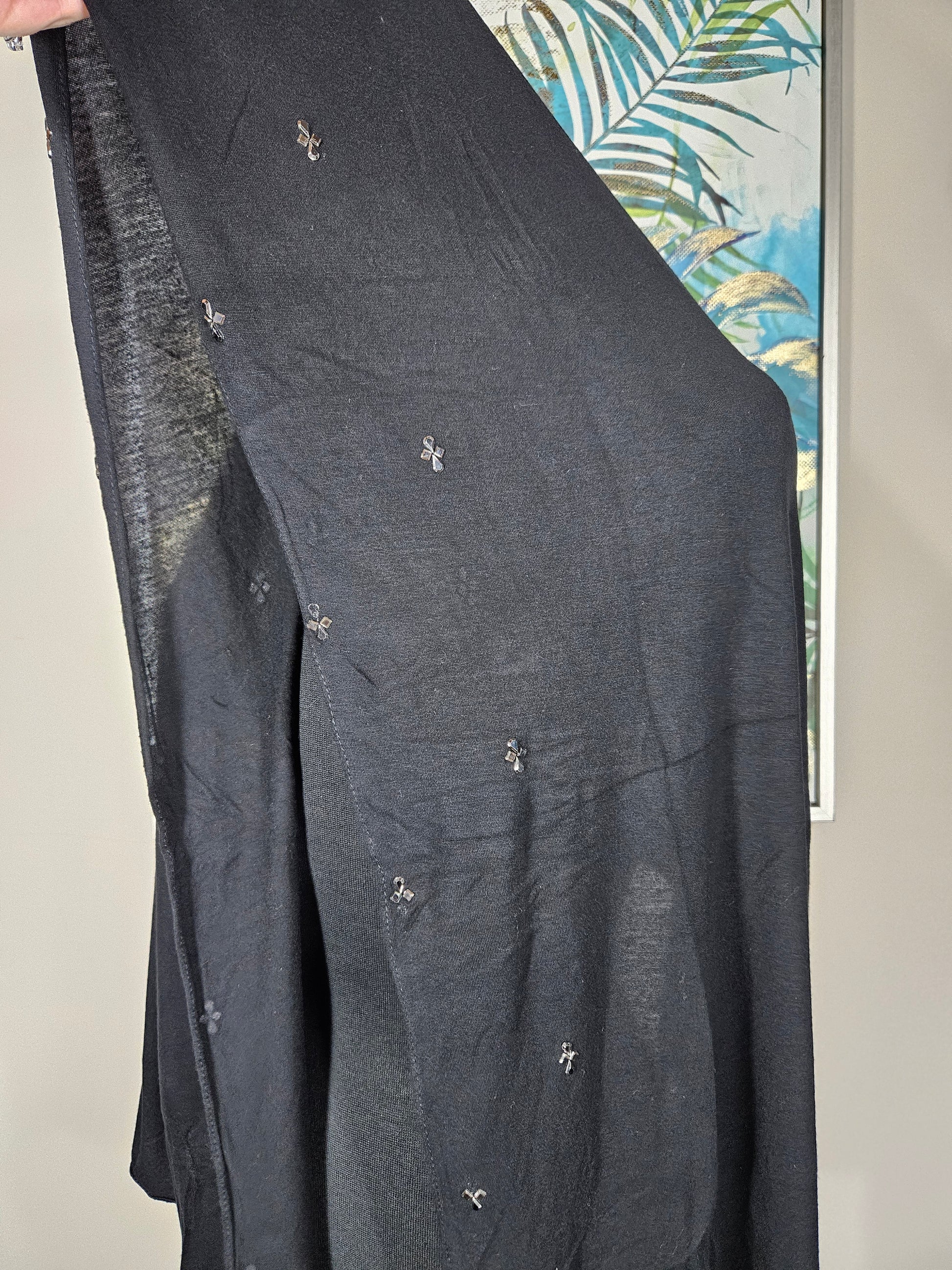 Elevate your hijab game with this stunning black hijab adorned with delicate flower gemstones. Perfect for adding a touch of sparkle to your everyday look or making a statement at special occasions, these shimmering floral accents catch the light beautifully. The classic black base pairs effortlessly with any outfit in your modest fashion wardrobe, while the gemstone details bring personality and glamour. Versatile, eye-catching, and undeniably chic—this hijab is your new go-to accessory for when you want to shine.